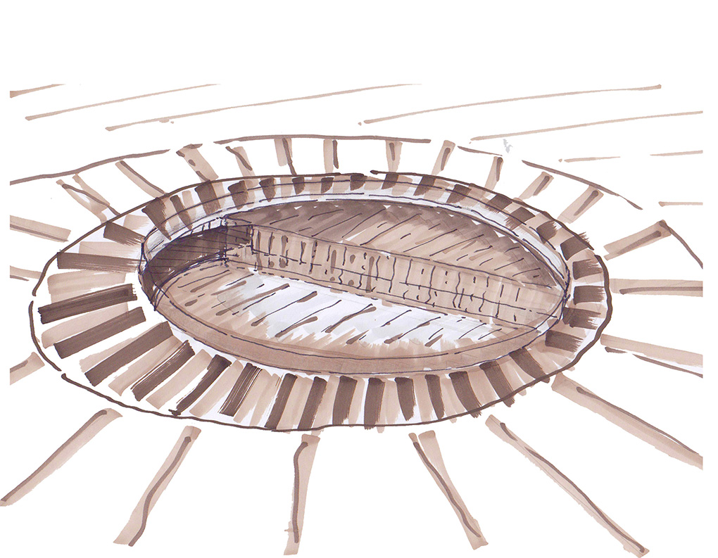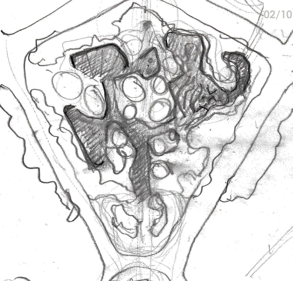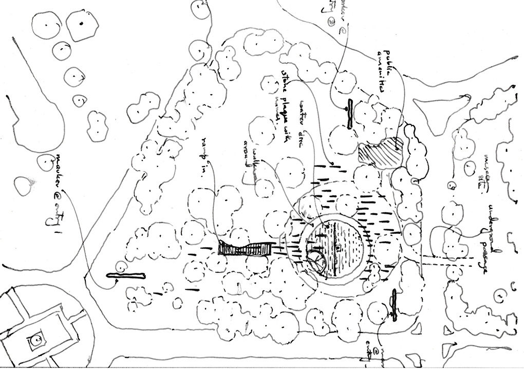 The linear line-like quality of the plan itself is balanced by the non linear disc which is offset from the centre, subterranean in its construction so as to not block the iconic landmarks that dote the landscape around.