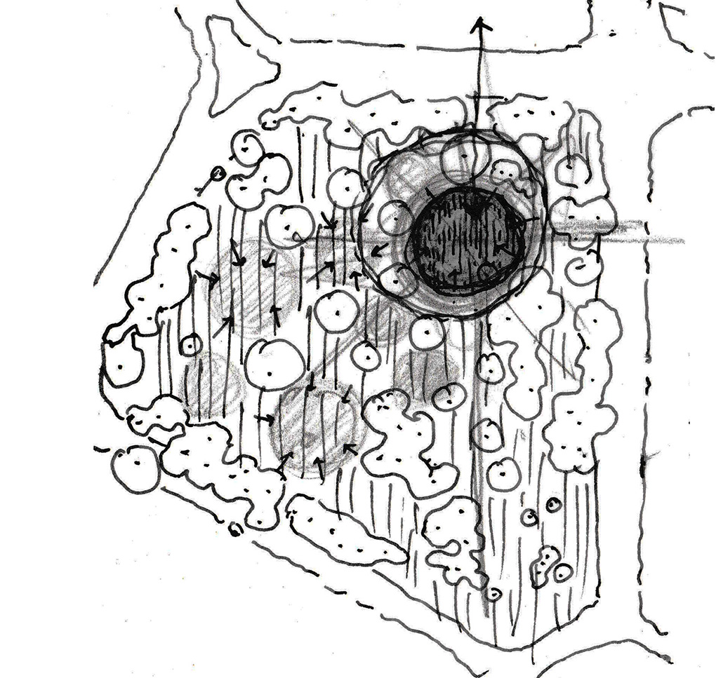 The proposed location for the circular trough is in close proximity to the Museum site and is nestled within a row of trees.