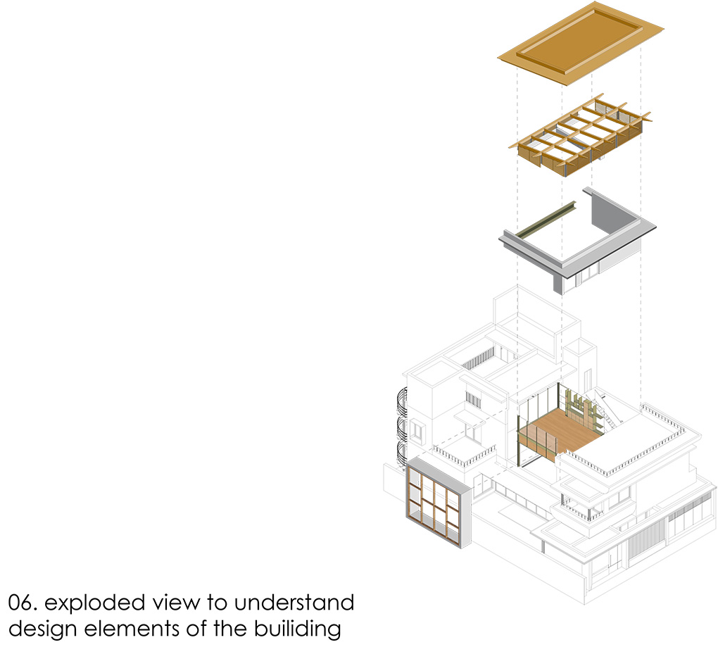 The house features a discreet entry through an intimate foyer space. The front edge is crafted to ensure adequate privacy and security while maintaining a sense of openness towards the street, which is adorned with three trees: a Gulmohar in the northwest corner, a Tabebuia Rosea on the northern side, and a mango tree in the northeast corner.